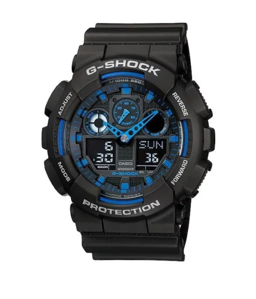 The Casio G-Shock GA-100-1A2DR is a standout model in the iconic G-Shock line, combining an aggressive military-style design with advanced functionality. With its bold black case and striking blue accents on the hands and subdials, this watch is both rugged and stylish—perfect for those who want performance without sacrificing aesthetics.