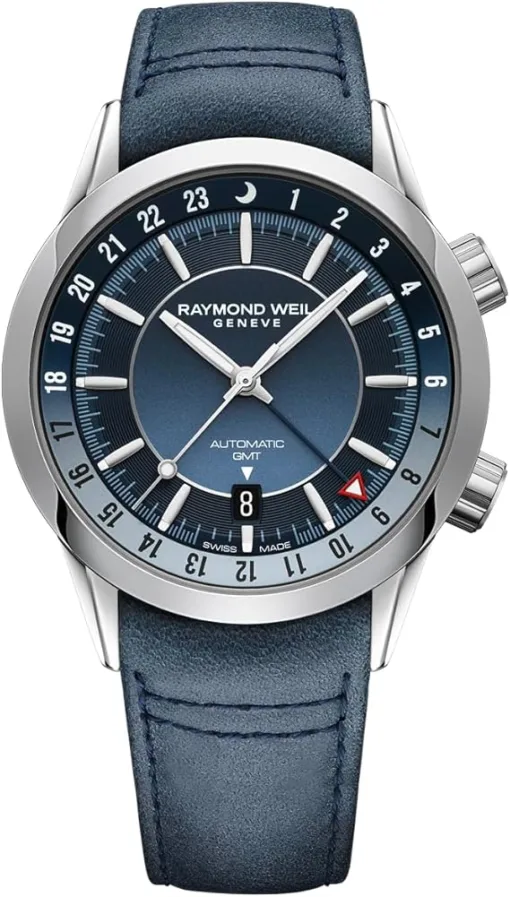 RAYMOND WEIL Freelancer GMT – Swiss automatic, 24 time zones, blue gradient dial, 41mm stainless steel case.
